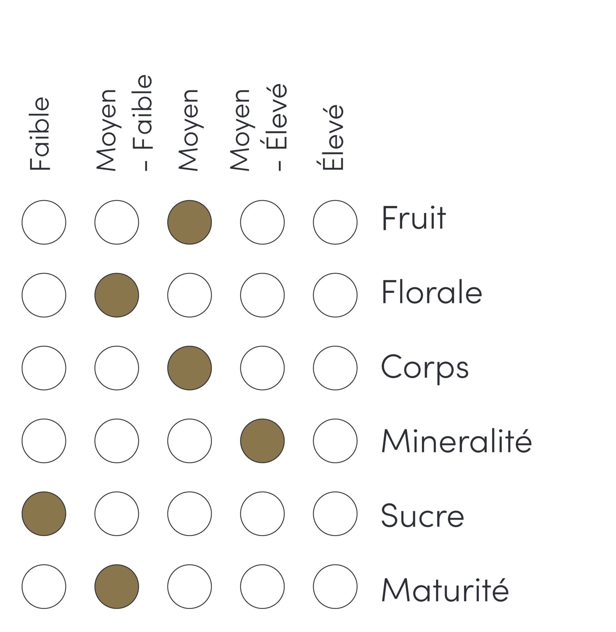 Questa cuvée corposa è un invito filosofico a riflettere sul significato più grande che possiamo dare al vino. Legando le persone, offrendo momenti di condivisione aperta, simboleggia la nozione di prospettiva tra l'uomo e il suo ambiente. Floreale e delicato, questo 100% Chardonnay è un vino da assaporare con saggezza.